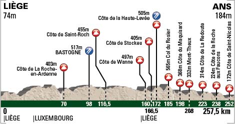 Duminică, odată cu primul rutier care va ajunge la Ans, se va încheia cea dintâi parte a sezonului. Şi ce cursă mai bună putea fi aleasă pentru asta, dacă nu Liège–Bastogne–Liège, cea mai veche clasică din ciclism. Total diferită de celelalte clasice din Ardeni, Liège–Bastogne–Liège va fi un test dificil pentru toţi cei prezenţi la start, mai ales odată cu a doua jumătate a traseului, când acidul lactic îşi va face simţită prezenţă din ce în ce mai mult. Caravana va pleca din Liège, va ajunge la Bastogne şi va termina apoi în suburbia Ans, după 257,5 kilometri şi 11 căţărări dure.