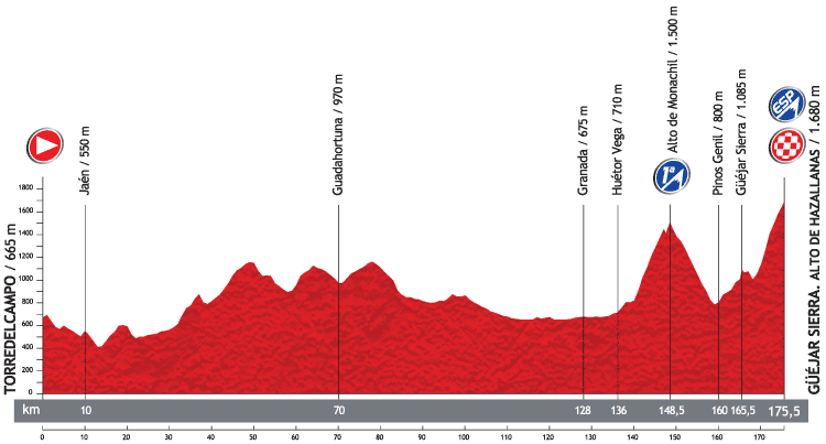 O nouă rundă grea, cu altă ascensiune ce va fi parcursă în premieră – Alto de Hazallanas. Înainte de aceasta, caravana va trece peste Alto de Monachil, căţărare de categoria întâi pe care se pot lansa atacuri fie din partea cicliştilor mai slab plasaţi la general, fie din partea celor care încearcă să îşi lase adversarii fără colegi. Pe Hazallanas, unde panta urcă până la 22%, nu se va juca doar victoria de etapă, ci şi un loc cât mai bun în clasament.