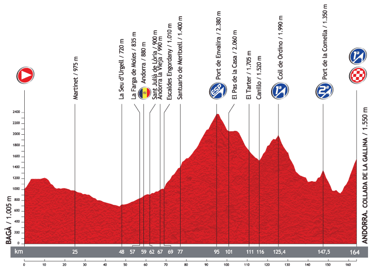 În 2012, etapa terminată pe Coll de la Gallina a fost una dintre cele mai frumoase: Alberto Contador a atacat dintr-un grup de patru, dar a fost prins şi depăşit de Alejandro Valverde şi Joaquim Rodriguez cu doar 10-15 metri înainte de final. Anul acesta, sosirea din Andorra promite cel puţin la fel de mult spectacol, mai ales că va fi precedată de trei căţărări repertoriate.