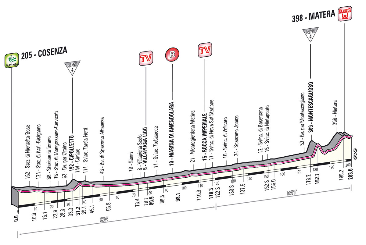 În urmă cu exact zece ani, caravana Turului Italiei a vizitat localitatea Matera, iar finişul a fost aproape identic cu cel de acum. Etapa s-a încheiat la sprint masiv, victoria fiind obţinută de Robbie McEwen, însă australianul a fost descalificat de către oficiali, după ce aceştia au ajuns la concluzia că rutierul echipei Lotto-Domo a făcut o manevră neregulamentară. Astfel, pe primul loc a fost promovat învinsul lui McEwen, Fabio Baldato.