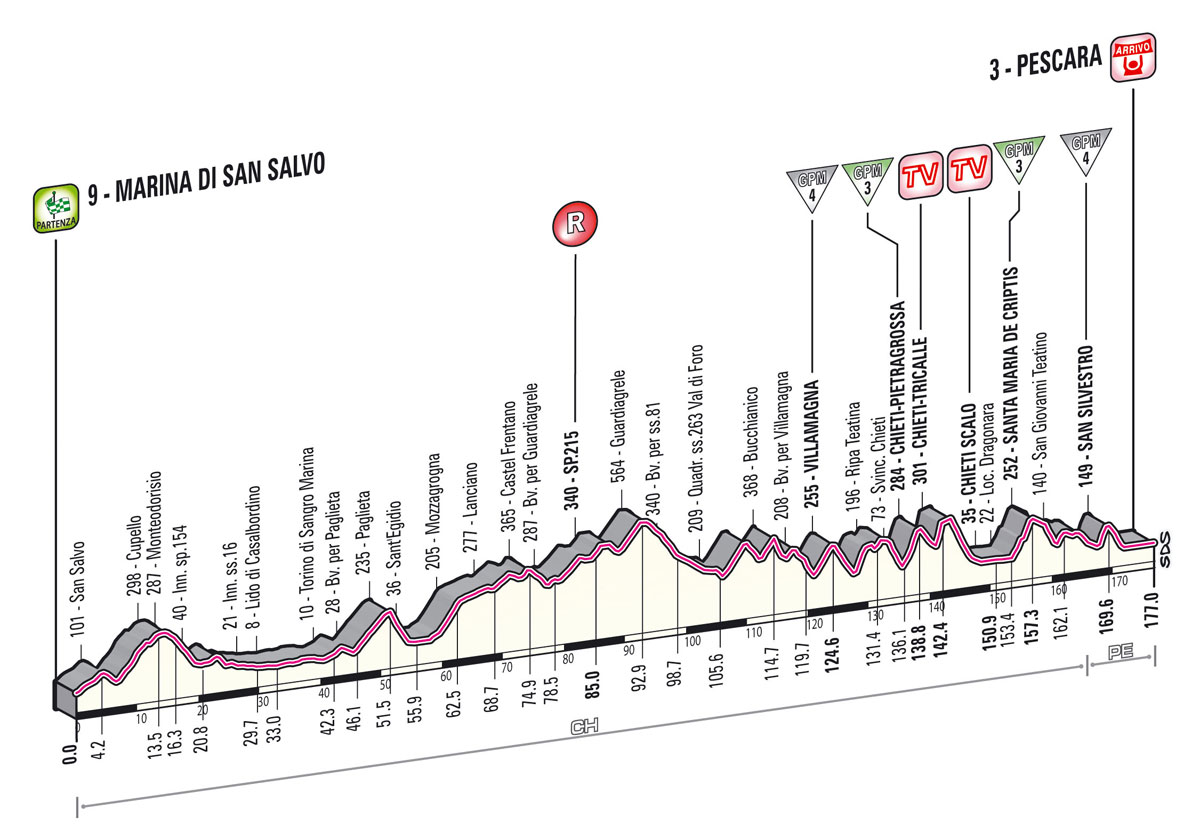 Vineri, când se va împlini o săptămână de la startul cursei, o evadare va avea prima şansă cu adevărat mare de a reuşi la această ediţie. Traseul în lungime de 177 de kilometri, care va purta plutonul între Marina di San Salvo şi Pescara, este înţesat cu mai mult de zece căţărări scurte, dar nervoase, dintre care patru sunt repertoriate. Va fi o rundă asemenătoare cu cea de la ediţia precedentă, încheiată la Porto Sant’Elpidio, când s-a impus Miguel Angel Rubiano Chavez.