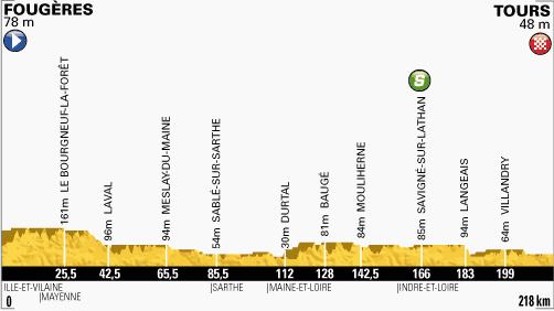 Plutonul Marii Bucle va sosi la Tours pentru a şaptea oară în istorie, la vizita anterioară în 2005, învingător fiind Tom Boonen, care i-a devansat pe Peter Wrolich şi Stuart O’Grady. Tours este un oraş care a oferit mai mulţi ciclişti profesionişti, cel mai cunoscut fiind Jean-Pierre Danguillaume, primul rutier triumfător într-o etapă terminată pe Col du Tourmalet (1974). În caravana ediţiei cu numărul 100 a Le Tour se află trei ciclişti născuţi în Tours – Jeremy Roy, Cyril Lemoine şi Jonathan Hivert – şanse mari fiind ca măcar unul dintre aceştia să plece într-o evadare.