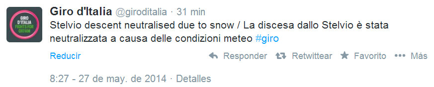 La cele de mai sus se adaugă şi mesajul postat pe contul de Twitter al competiţiei şi şters după câteva minute. Este adevărat, Twitter nu e un canal oficial în timpul cursei, dar graba cu care a fost eliminată acea postare nu are cum să nu ridice multe semne de întrebare cu privire la deciziile organizatorilor. Şi pentru ca haosul să fie complet, atenţie la ultimele trei declaraţii. Prima îi aparţine lui Mauro Vegni, directorul cursei, iar cea de-a treia lui Charles Wegelius, directorul sportiv al lui Garmin-Sharp. Încă o dată, la fel ca în cazul mesajelor transmise prin canalele de informare, credibilitatea Turului Italiei are de suferit serios. Între cele două declaraţii este şi cea dată de Marco Velo, care conducea motocicleta aflată în faţa lui Nairo Quintana.