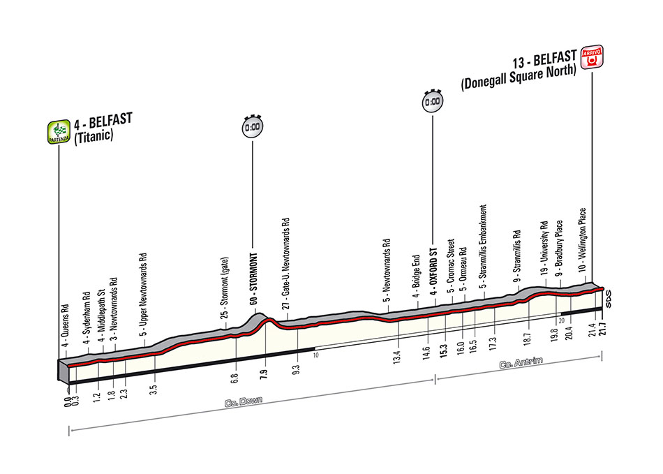 La fel ca în 2011, cursa va începe cu un contratimp pe echipe. Dacă atunci s-a plecat din Venaria Reale, o localitate aflată în apropiere de Torino, acum startul va fi dat din Belfast, mai exact, din Titanic Quarter, acolo unde a fost construit celebrul pachebot, în urmă cu mai bine de un secol. Traseul în lungime de 21,7 kilometri este plat, cu excepţia unui scurt deal care apare în prima treime a cursei, acolo fiind plasat şi primul punct intermediar. Chiar dacă sunt câteva viraje pe final, acestea nu ar trebui să joace un rol important, lucru ce nu se poate spune despre vreme, care se anunţă capricioasă vineri seară, mai multe duşuri programate în timpul etapei.