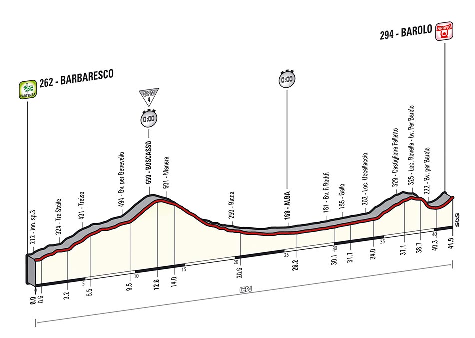 Până să ajungă în munţii înalţi, favoriţii la clasamentul general sunt aşteptaţi să lupte în contratimpul individual dintre Barbaresco şi Barolo, care se va desfăşura pe distanţa de 41,9 kilometri, pe un traseu valonat. Etapa va începe direct în urcare, pe o căţărare de categoria a patra, în lungime de 12,6 kilometri şi cu o pantă de 5% în porţiunea finală. După vârful ascensiunii, acolo unde este plasat primul punct intermediar, va urma o coborâre rapidă şi o porţiune de plat, la jumătatea căreia se află al doilea punct de control.