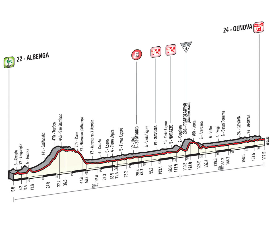 The Pratozanino ascent (4th category) will be the first categorized climb of the 2015 Corsa Rosa, which means that there will be a big fight there between the riders in the breakaway, as the blue jersey automatically guarantees extra publicity. Then, after reaching Genova, the route takes the 9,5 km-long city circuit, which will be covered twice. The course runs through Piazza de Ferrari, then goes down to Piazza Brignole, where the road slowly starts to rise, up to Piazza Verdi. Here, a 1-km dash with a 4% gradient leads to Albaro, followed by a false-flat drag and the descent down into Boccadasse, where the route reaches the seafront. The course runs flat up to the last kilometre (completely straight), where the road climbs steadily, with gradients of around 2%.