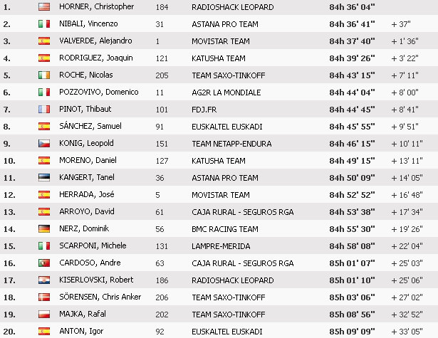 Aşa arată clasamentul general final al Turului Spaniei, cursă care s-a remarcat prin spectacol, dramatism, tensiune şi un învingător-surpriză: Chris Horner.