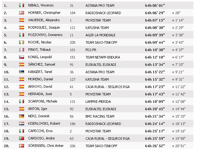 Acesta este clasamentul general al Turului Spaniei după 16 etape, cu Vincenzo Nibali lider, avansul italianului fiind de 28 de secunde în faţa lui Chris Horner. Practic, este o inversare faţă de situaţia din urmă cu o săptămână, când americanul ocupa primul loc. Alejandro Valverde e cel mai bine plasat reprezentant al gazdelor, pe ultima treaptă a podiumului, întârzierea sa fiind de un minut şi 14 secunde.