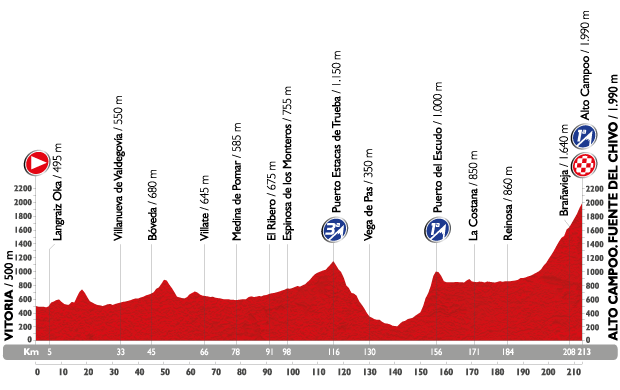 Cea mai lungă etapă de la această ediţie îi va duce pe rutieri în Ţara Bascilor, unde îi vor aştepta mai multe ascensiuni repertoriate. Ultima este Fuente del Chivo, care impresionează prin lungime, 21,25 de kilometri. Începutul acesteia e foarte lejer, greul urmând să vină odată cu ultima treime. Cea mai dificilă pantă (8,9%) va apărea cu mai puţin de doi kilometri înainte de sosire, ceea ce înseamnă că acolo vor veni şi atacurile serioase.